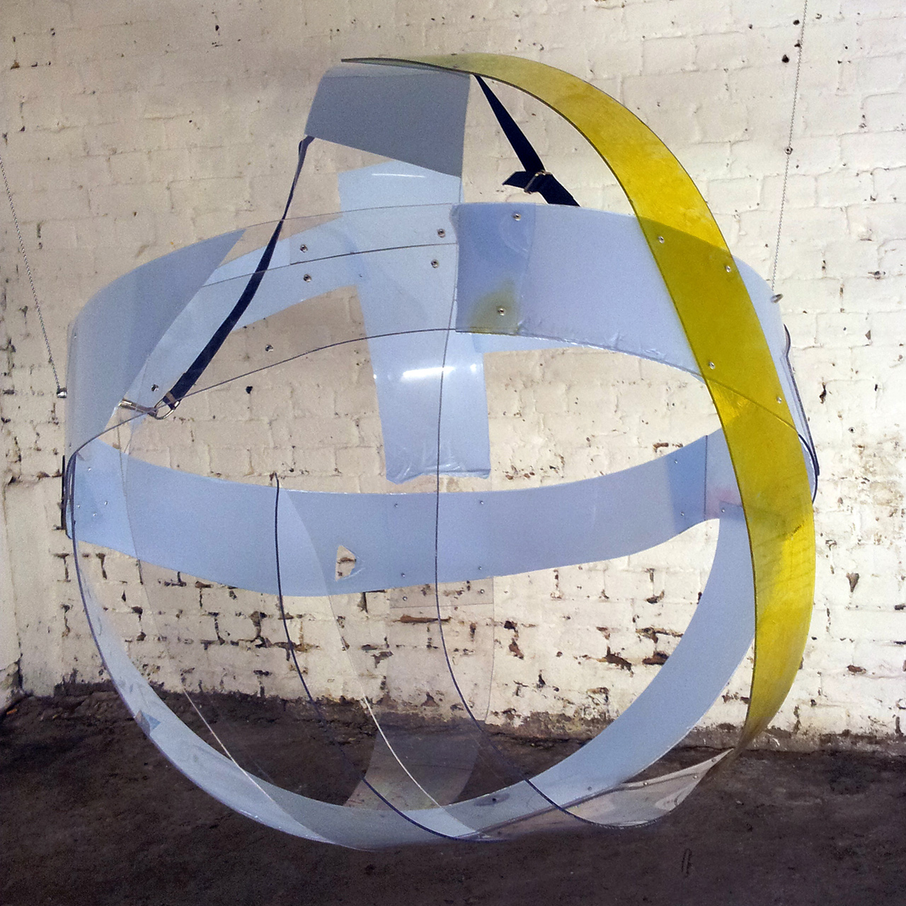 Assemblage (on usability) – Finger painted vitrea and protective foil on synthetic glass, with strap (110 × 105 × 105 cm) – Added in 2012