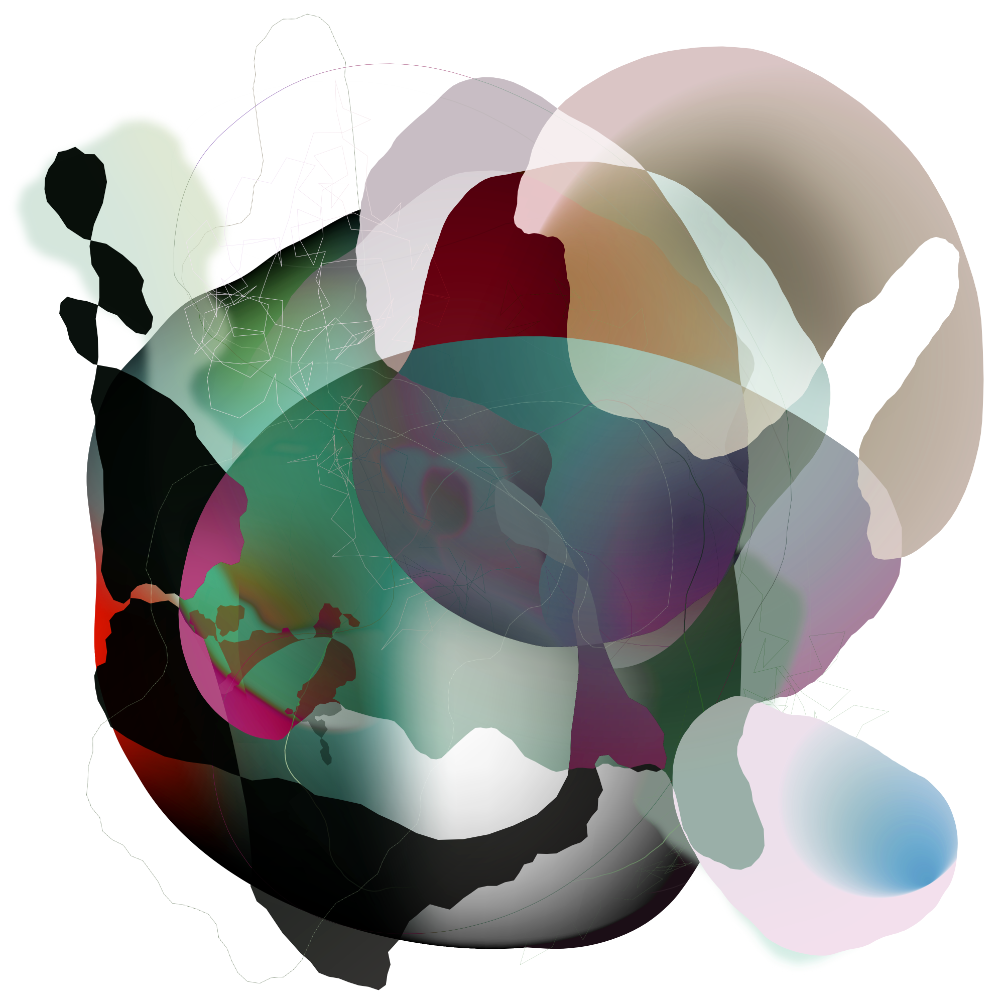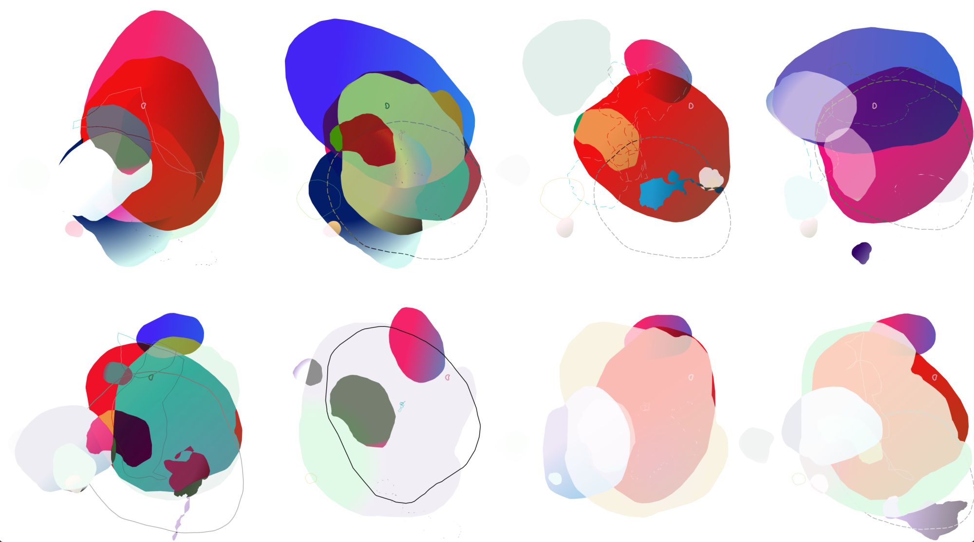A first attempt at simulating the smooth, round curves proved "surprisingly satisfying." The shapes reminded him of the sculptural work of Hans Arp — biomorphic abstraction, organic without being figurative. But pure random generation "was quickly becoming a bit boring": it produced variety without direction. The question shifted: could a feedback process between artist and software "be considered a kind of dialectic"?