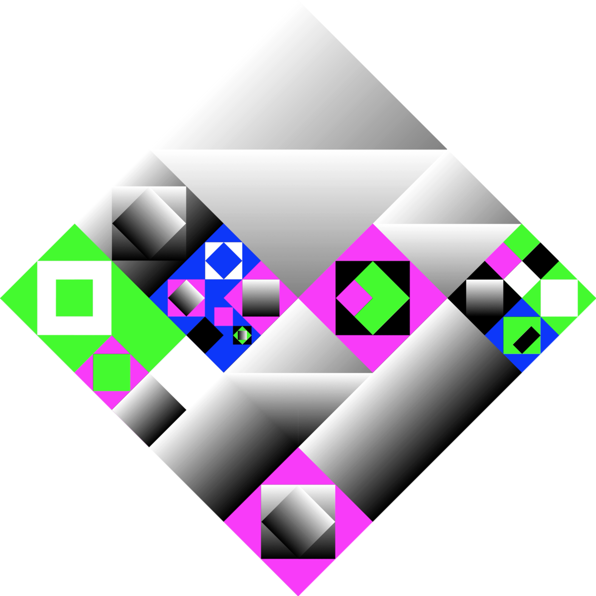 The image makes the palette ancestry unmistakable: royal blue, vivid green, fuchsia/magenta, white, black, and grey gradients — all at maximum saturation or pure greyscale — against a hot-pink background that is itself the magenta pushed into the surrounding field. The palette that was "hand-picked" in 2004 is now being deliberately quoted, examined, extended. Where the 2004 Flash work composited shapes as flat fills, token #30 introduces blending modes: shapes are composited against one another, so that overlapping regions produce mixed luminosities and colour interactions that lie outside the original four-element palette. The extremes are still the input; blending produces the intermediate territory they exclude.