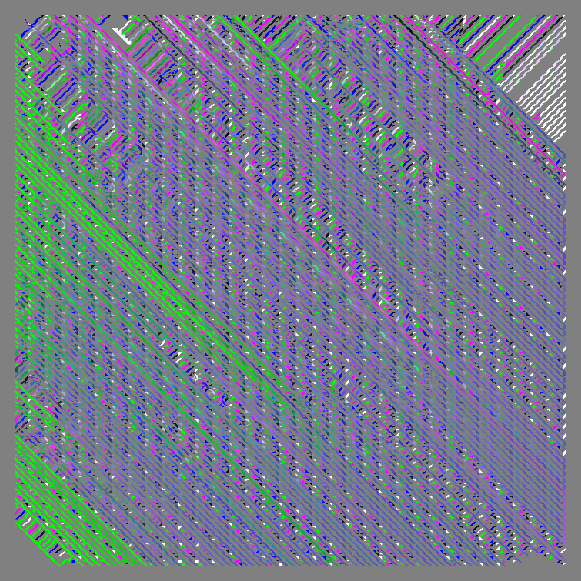 The fourth instance of the palette applies it to a cellular automaton: Stained Unravel (Markov's Dream), token #6 of the Stained Unravel series (2026). The medium has changed completely — from Flash to squircles to on-chain CA — but the same colours reappear: the vivid green diagonal band that sweeps across the grey-violet field is the same rgb(0,255,0) that has been in the palette since 2004. The grey-violet ambient texture draws on the blue and the black-to-white gradient. The small white rectangle in the upper-right corner is pure rgb(255,255,255).