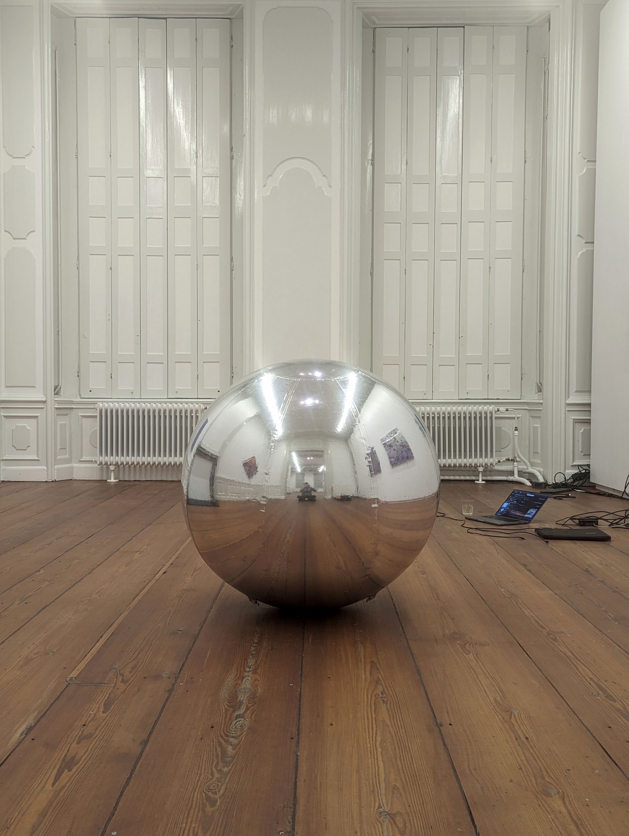Recursive Intervention: "The exhibition space and the works in it are reflected by a ready-made mirroring inflatable, causing the space to contain a compressed version of itself." The room sees itself; the space contains the space. Recursion made architecturally inhabitable — visitors move inside a structure that includes them within its self-image (→ works-overview).