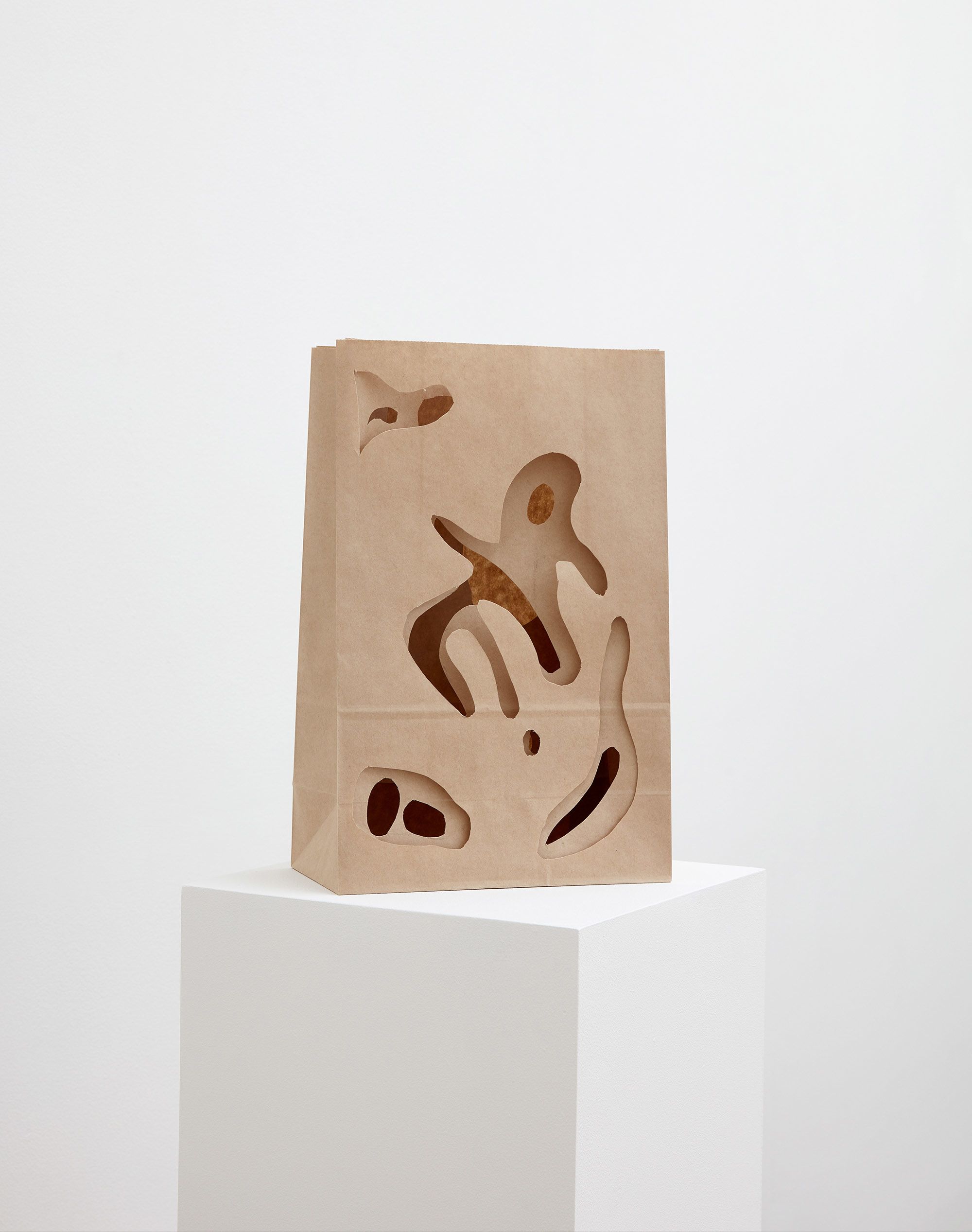 Another Bag (2019): hand-cut brown paper bags, "based on the work 'Constellations' by Jean Arp from 1938." Arp's Constellations arranged elements by chance (Laws of Chance). The bags are cut, not found — but the reference locates the work within the Dada chance tradition (→ randomness and pattern, 878).