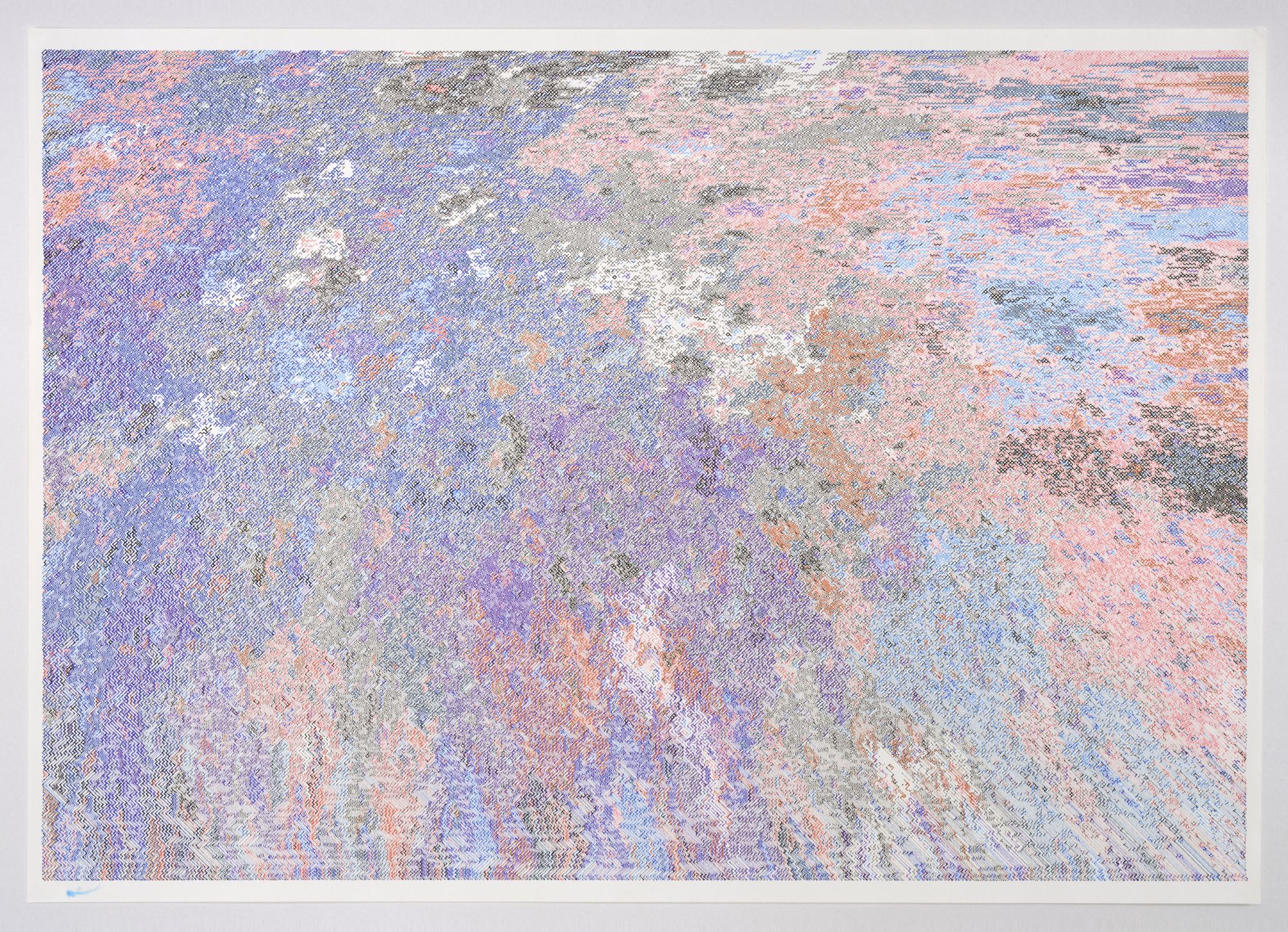 Cloud Writings (2024–present): the dominant current series. Plotter drawings on Hahnemühle, Terschelling, Fabriano, watercolour paper. The titles are elemental and atmospheric — Helmgras, Breeze, Shroud, Valley, Atlas, Hail, Drift, Mold. Many works use probability as spatial logic: