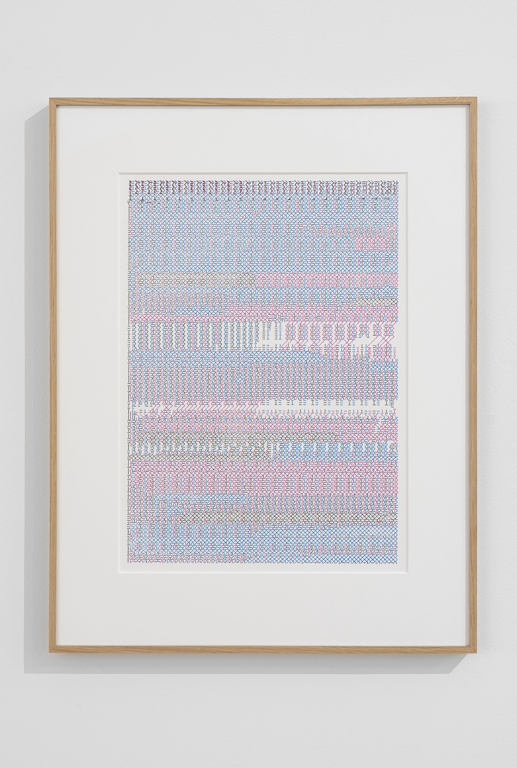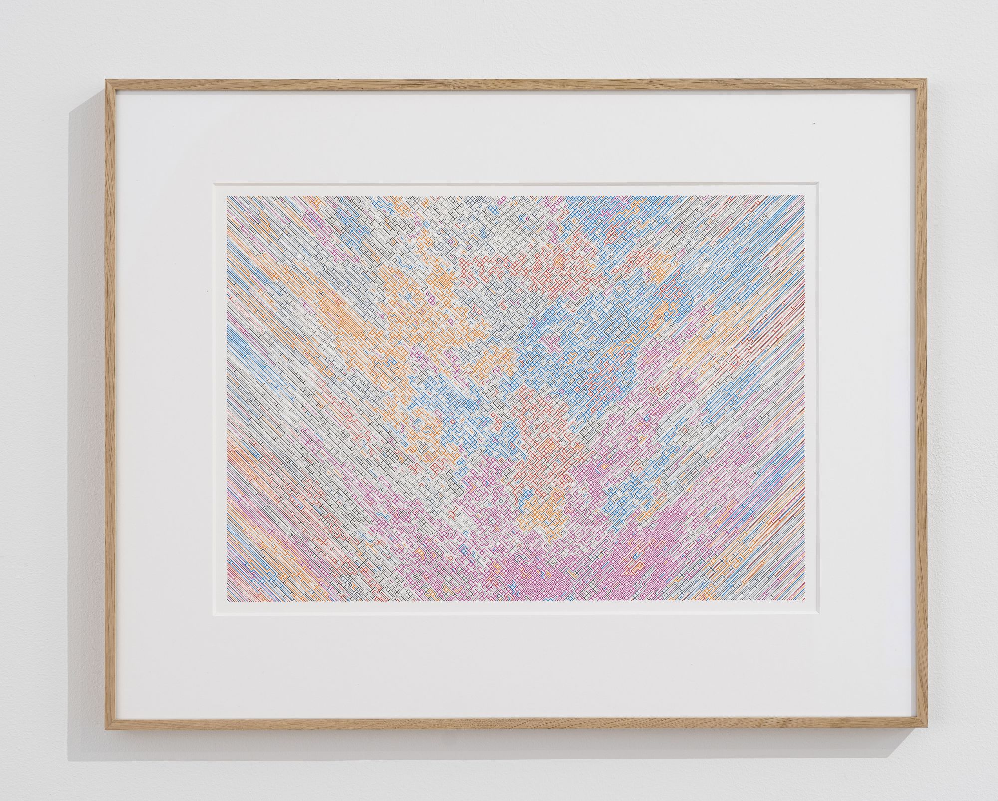 Beads / Beads II / Beads III (2025): "Hand-coloured plotter drawing, based on the work Anni. The word 'bead' derives from Old English gebed, originally meaning 'prayer'." Prayer beads are a counting technology — computation as devotion. The works are generated algorithmically and then colored by hand: two processes overlaid, neither erasing the other.
